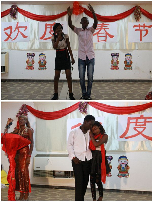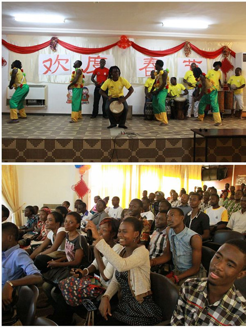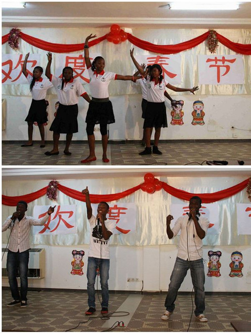 联欢活动在洛美地方鼓舞艺术团精彩的舞步中拉开序幕。他们表演的极富节奏感的传统击鼓乐和精彩的地方传统舞蹈活跃了现场气氛。接下来孔院学生表演的歌伴舞《真爱冒险》,活泼热情,使观众们的热情高涨,更是把春节红红火火、欢欢喜喜的情景带进了现场;三位男生合唱《听妈妈的话》,温馨的歌词让我们不禁想念母亲的温暖,动情的歌唱引起了所有观众的共鸣;歌伴舞《天涯歌女》,表演者丝丝入扣的演唱技巧,稳重大气的台风与震撼人心的双人伴舞仿佛把我们带到了那个古老的年代,你侬我侬,不需誓言,不需任何人的见证,郎似针,侬似线,穿在一起永不离分;在写汉字、剪纸表演中,学生们剪了一匹正在奔腾的骏马,书写了马到成功,马年大吉表达了他们对马年的期望与祝福;孔子学院赵钰宁老师与三个学生表演的小品《我要上节目》引发了又一次高潮,节目生动有趣,老师与学生们的表演让台下的学生们深有感触;诗朗诵《雨巷》、太极拳表演、合唱《送别》、女生独唱《爱你不是两三天》等节目,让来宾掌声不断;当《甜蜜蜜》的音乐响起时,刘大使和外方院长佳思美女士登台与学生们一起演唱,甜蜜蜜,甜蜜蜜,愿我们此生都拥有今天甜蜜的回忆。联欢活动在刘大使、华人代表与孔院师生集体上台演唱中文歌曲和表演多哥的传统舞蹈中落下帷幕。