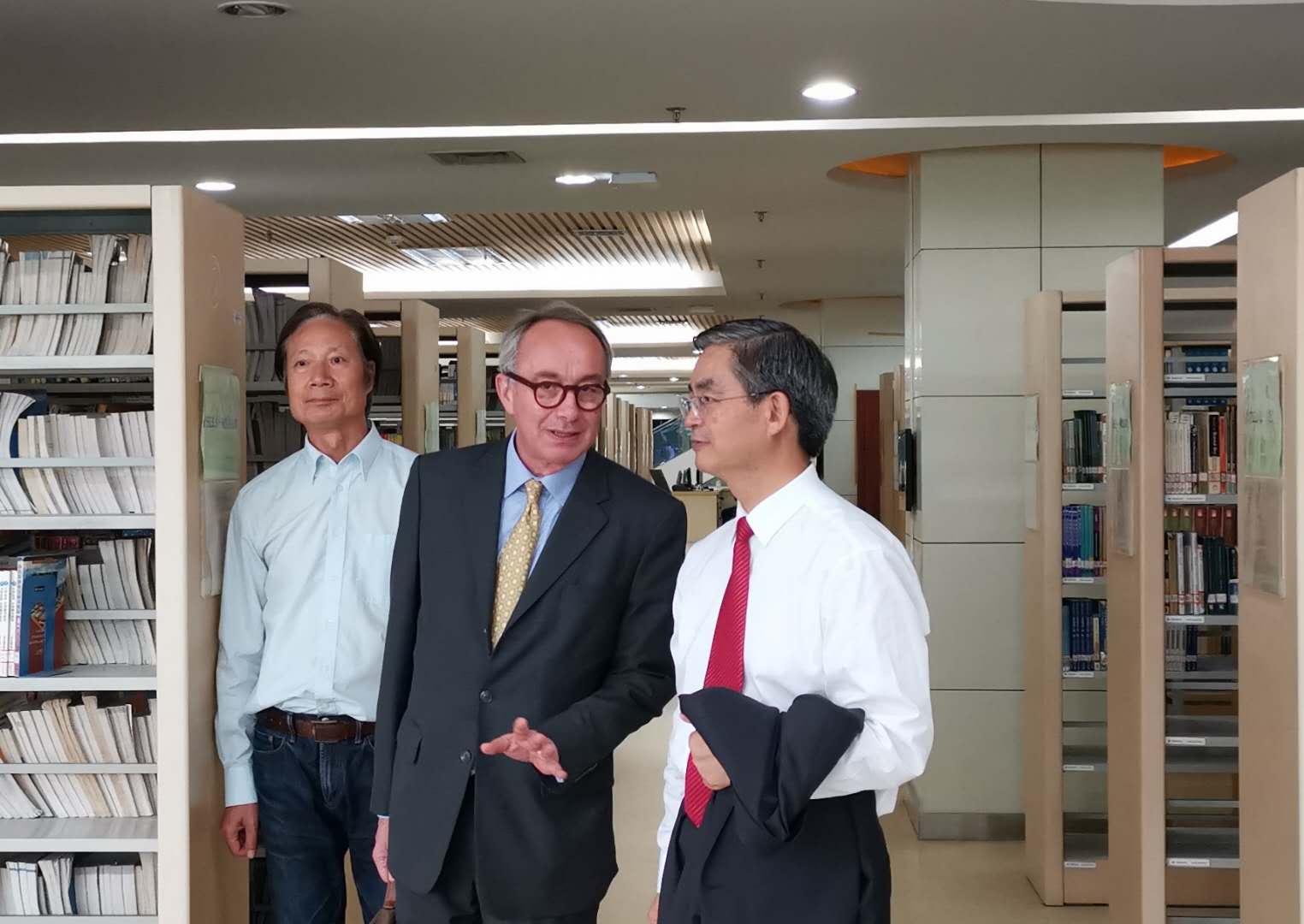 随后,李克勇校长陪同白屿淞总领事参观了学校图书馆和歌乐广场,参观了重庆法语联盟教学办公场地,与法语联盟负责人和法国大学署负责人进行了工作交流。总领事对川外的办学条件和多元的校园文化表示赞赏,对川外积极支持重庆法语联盟的工作表示感谢。他说,他曾在法国驻华使馆工作,曾任法国驻广东领馆总领事,去过中国的许多地方,他是少有的不喝咖啡而喜欢喝中国茶的法国人,作为法国驻成都总领事,他非常愿意同川外开展更多的交流与合作,愿意积极支持川外的法语教学和多元文化交流活动。