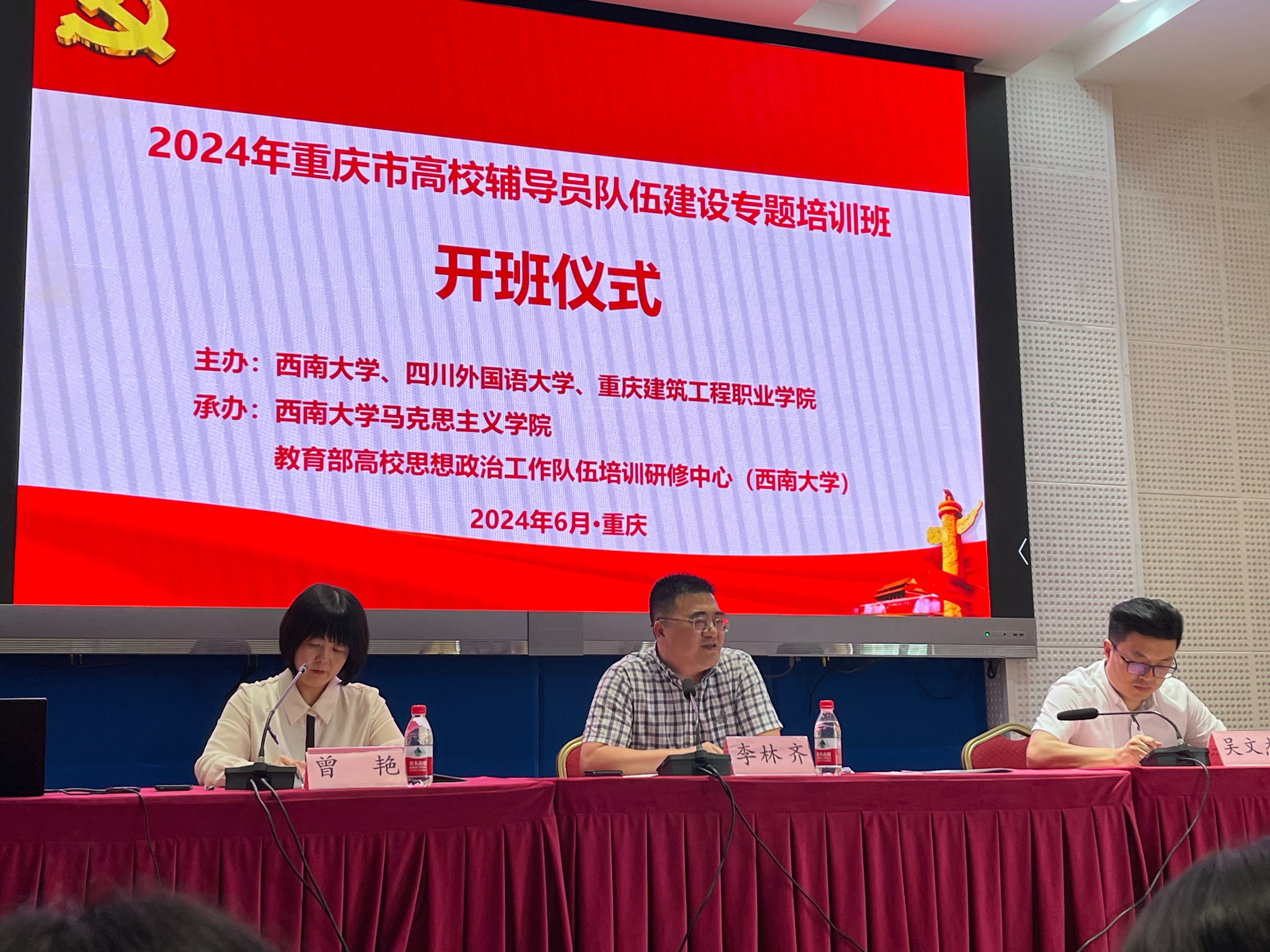 6月11日,开班仪式上,开班仪式上,西南大学马克思主义学院党委书记吴文杰致辞。中共重庆市委教育工委、重庆市教委宣教处处长李林齐作开班动员讲话。李林齐处长指出,本次专题培训班具有精心谋划、时机重大,精心组织、形式新颖,精心选拔、队伍精干的三个特点。最后,他结合当前高校思想政治工作新形势新任务,向参训学员提出学习要求。开班式上,我校国际工商管理学院团总支书记、辅导员宋璐作为三位学员代表之一发言,表示要珍惜培训机会、加强学习交流、力求学有所获。