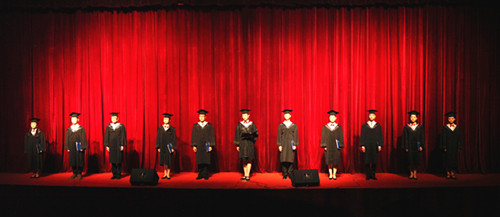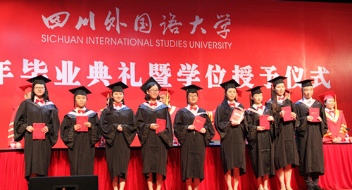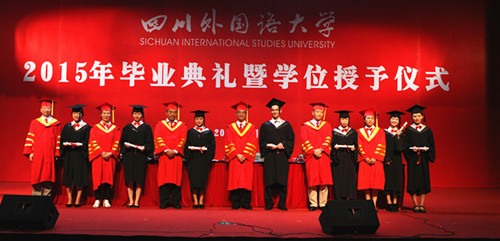 典礼开始前,现场播放毕业纪念沙画,记录了2015届学生4年来在学校成长成才的点滴。11名身着学士服的毕业生分别用自己所学语种向母校深情告别。四年川外人,一生川外情,临别依依,言语万千,此刻都汇成一句祝福、道上一句珍重。面对即将的离别,同学们依依不舍,现场很多同学已热泪盈眶。
