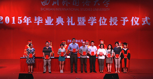 王鲁男副校长宣读了《四川外国语大学关于授予2015届徐潮等2997名本科毕业生学士学位的决定》、《四川外国语大学关于表彰2015届优秀本科毕业论文的决定》和《四川外国语大学关于表彰2015届优秀本科毕业论文指导教师的决定》;张艳副书记宣读《四川外国语大学关于表彰2015年毕业生就业创业先进个人的决定》、《四川外国语大学关于表彰2015年优秀大学毕业生的决定》和《中共重庆市教育工委重庆市教育委员会关于2015年普通高等教育优秀毕业研究生和优秀大学毕业生的通报》。随后,与会领导分别为获奖师生颁奖。