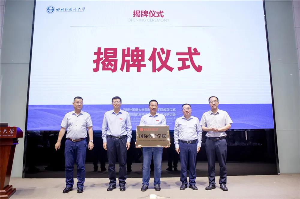 市委宣传部副部长、市政府新闻办主任马然希到会表示祝贺,并与四川外国语大学党委书记邹渝、中国外文局当代中国与世界研究院院长于运全、新华社重庆分社副社长王金涛共同为国际传播学院揭牌。