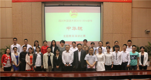 2015年9月24日晚,2015-2016学年度“中华魂”(大国礼赞)主题教育演讲比赛在宏文楼国际报告厅举行。本次比赛由党委宣传部、学工部(学生处)、校团委、关心下一代工作委员会联合主办,校学生会承办。莅临此次比赛的嘉宾有副校长郑白玲、党委宣传部部长崔光军、学生处副处长古晶、团委书记丁欢,关工委的王之起、贾锡本和岑中华老师。邀请到的评委有留学生部潘杰老师、校党委宣传部侯丽娟老师、学生处朱磊老师、校团委倪静老师和校学生会主席逄淋淋。