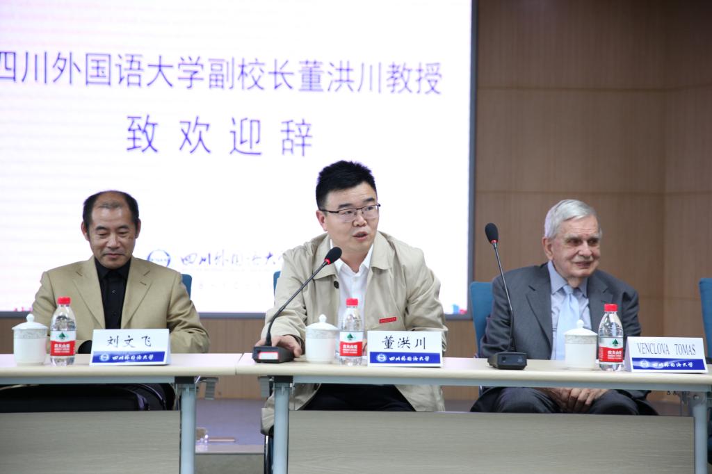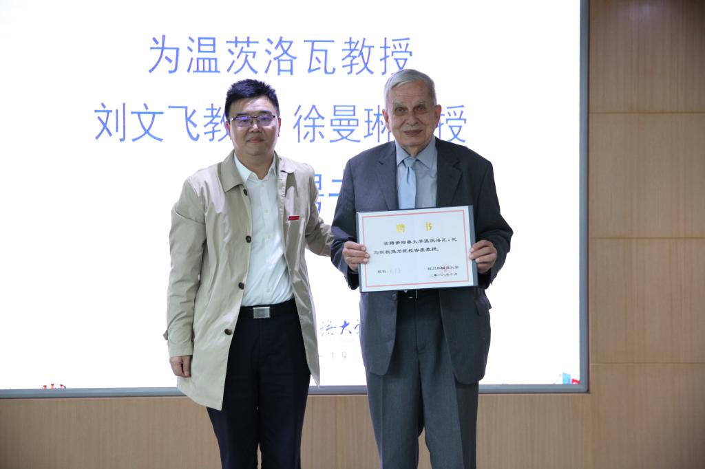 副校长董洪川为温茨洛瓦教授颁发四川外国语大学客座教授聘书