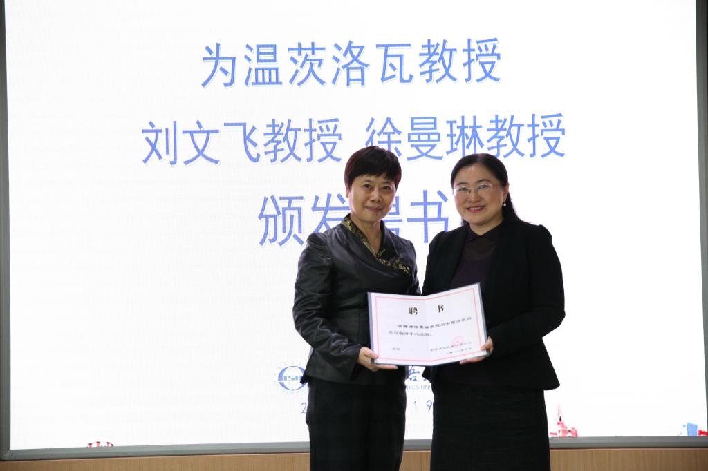 中外文化比较研究中心主任冯亚琳为徐曼琳教授颁发中心主任聘书