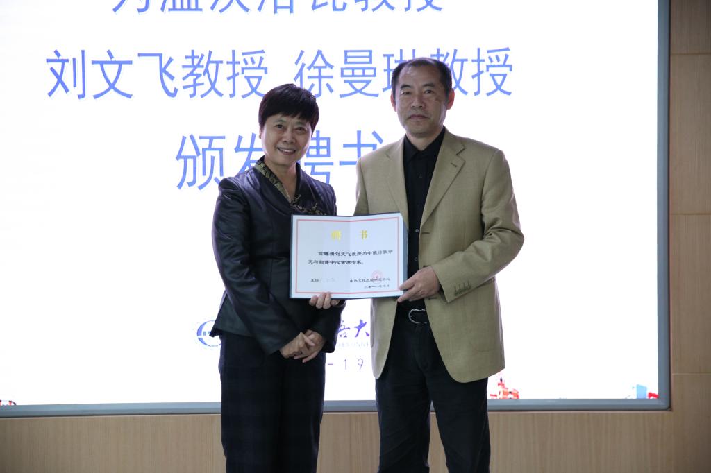 中外文化比较研究中心主任冯亚琳为刘文飞教授颁发中心首席专家聘书