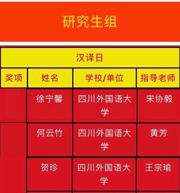 另外,我系研究生导师宋协毅教授、黄芳教授、王宗瑜副教授、赵晓燕副教授荣获优秀指导教师奖,四川外国语大学荣获优秀组织奖。