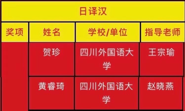 本次大赛共有来自中国和日本500多所高校及众多企业的近4000名选手参加。11月27日,获奖名单揭晓,我系研究生在大赛中取得了优异的成绩。徐宁馨获得研究生组汉译日比赛一等奖,何云竹、贺珍获得三等奖;黄睿琦、贺珍获得研究生组日译汉比赛三等奖。