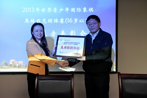 表彰会上,与会领导代表组委会向全体志愿者颁发了志愿者服务证书,周擎擎等20名志愿者被评为优秀志愿者,我校被授予“2013年世界青少年国际象棋奥林匹克团体赛(16岁以下)优秀志愿者组织单位”荣誉称号。