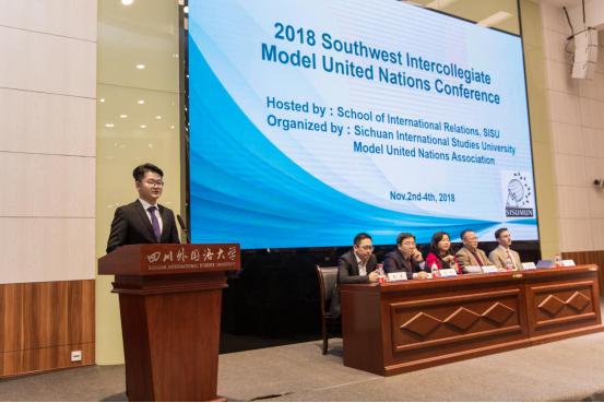 开幕式上,组委以视频形式回顾了四川外国语大学和川外模联协会的发展历程与各项成就,并简单介绍了本次模联大会四个委员会的主题。王伟对各位校外代表表示热情的欢迎,并借川外模联成立十五周年的机会向川外模联人进行鼓励。王伟表示,我们要紧随时代主旋律,共赢全球挑战,共担全球责任,构建人类命运共同体。国际关系学院能够深入贯彻学校的培养理念,培养复合型国际人才,积极提高学生的国际视野,有助于学生实现这一目标。刘玉梅对本次大会寄予了深切祝福,希望各位代表在此次大会进行深入交流和积极沟通,共同商讨国际热点问题的解决方法。刘玉梅指出,国际关系学院一向重视模联的发展,并且希望学子能够将模联当作了解世界的窗口,积极准备成为语言和学术的复合型人才,熟练掌握语言、锻炼自己的外交能力。外籍教师Christopher也对本次大会表示期待。开幕式最后,大会秘书长落槌,宣布2018年西南高校模拟联合国大会正式开始。