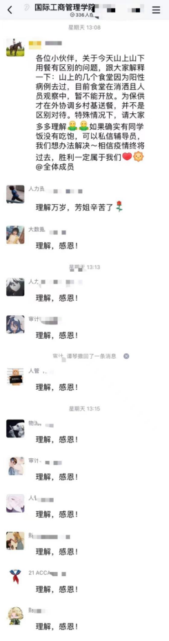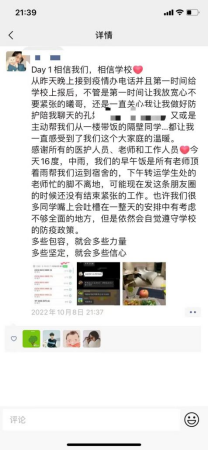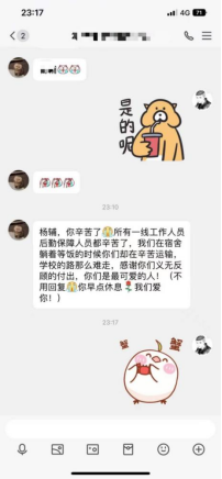 学工队伍尽锐出战,按时领取配送近四百名学生的早午晚餐,保障学生基本需求,及时了解学生在校情况,同时为校内租住学生送餐。快速组织核酸检测,切实落实好学校学生宿舍包干负责制,实现精准防疫、精细服务。关注学生身心健康,以文字、图片、推文、线上点名会等形式对学生进行有效教育引导和心理疏导。围绕学生,倾情付出,对学生们的关爱在字里行间,在无声的行动之间。