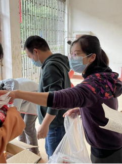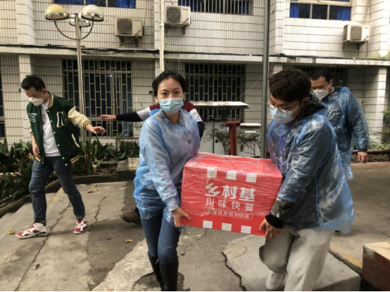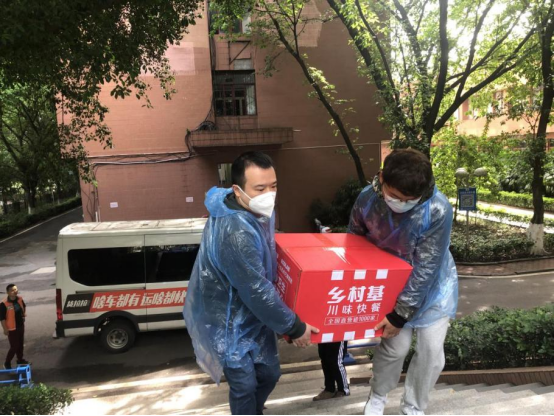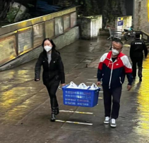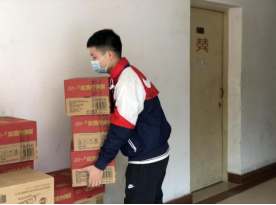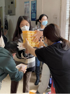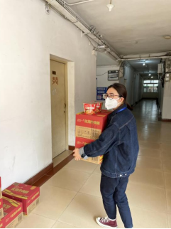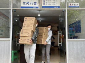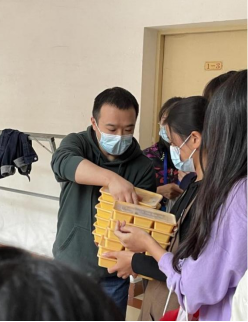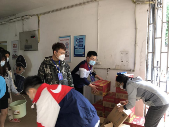 学院领导老师在学生公寓转运分发餐食