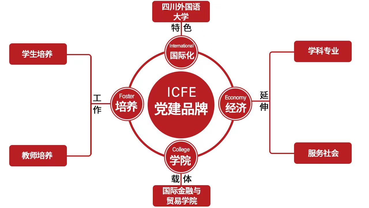 在“ICFE”党建品牌中,“I”即“国际化(International)”,是支部作为外语院校基层党组织强外语与国际化特色的体现,也是支部在建设过程中,强调中国经济故事“走出去”、积极吸纳海归青年教师入党、为留学生讲述中国发展故事的体现;“C”即“学院(College)”,是支部所在国际金融与贸易学院(College of Finance and Economics)英文缩写的首字母,是教工支部建设载体的体现;“F”即“培养(Foster)”,是支部铸魂育人、立德树人以及培育教师队伍具体工作的体现;“E”即“经济(Economy)”,是支部所在经济学学科专业建设的体现,也是支部致力于服务地方经济发展的体现。支部推进建设学习型、创新型、服务型先进党支部,打造了“一个核心、四个引领、两个平台、三个保障、三个结果导向”的“14233”党建工作机制体制。