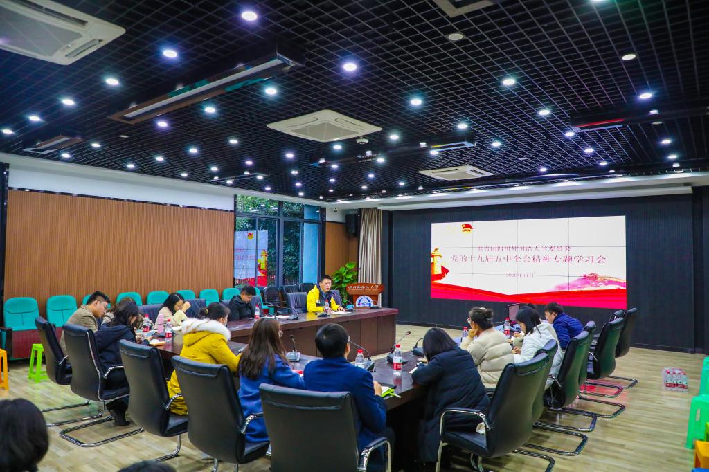 11月25日下午,校团委召开专题学习会,深入学习党的十九届五中全会精神,同时布置安排全校团组织、学生会组织启动深入学习宣传党的十九届五中全会精神的工作,团结动员全校各级团组织和广大团员团干部坚定信心决心,发挥自身优势,为开启“十四五”、奋进新征程凝聚共识和力量。校团委书记丁欢,各院系团总支书记参加会议。校团委副书记冯波主持会议。