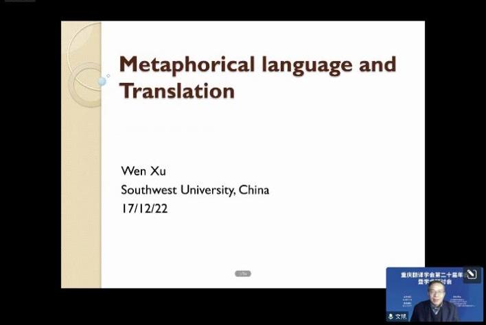 西南大学外国语学院院长文旭在其发言《比喻性语言及其翻译问题》中提出:使用比喻性语言的基础仍然是说话人所具有的语言知识以及各种认知能力,语言的比喻用法是语言创造性的最高表现。因此,比喻性语言的翻译同样涉及译者的各种知识和认知能力。基于英汉语料,结合隐喻的特征和功能,他还阐释了翻译的隐喻等议题。