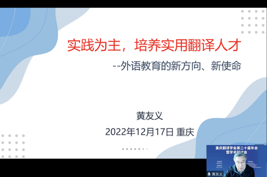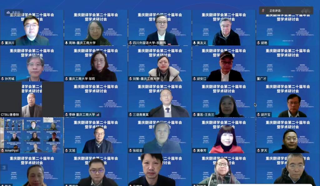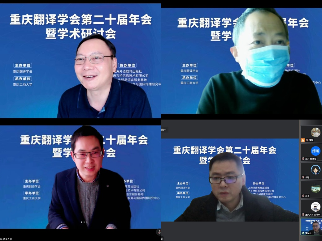 12月17日,由我校和重庆翻译学会主办、重庆工商大学承办的重庆翻译学会第二十届年会暨学术研讨会以线上方式隆重召开。与会专家学者围绕“翻译与中国文化国际传播”这一主题展开了热烈研讨。会议和直播平台上参会者总计近3000人。开幕式由重庆工商大学外国语学院院长周琳主持。