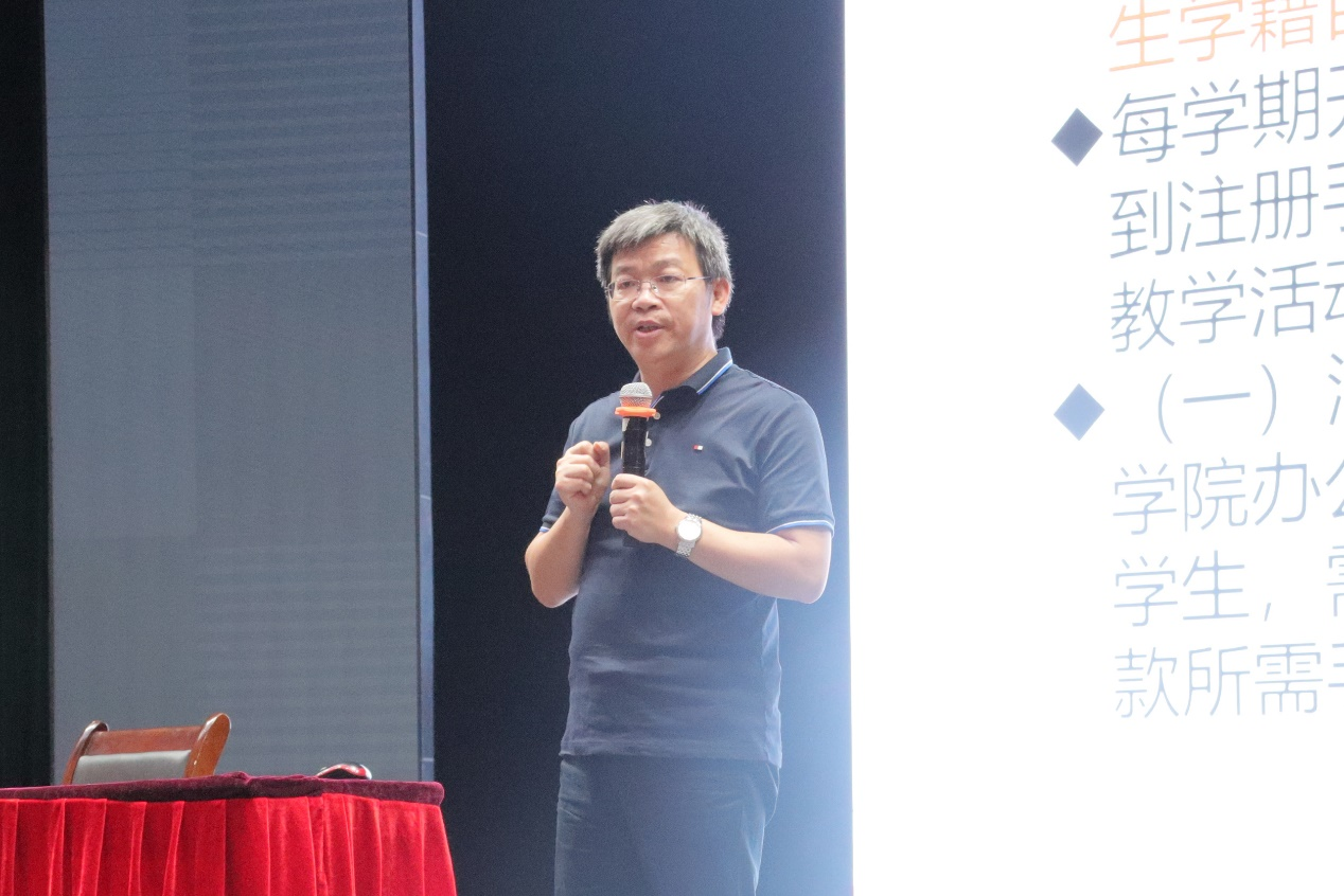 教务处教务科吴必鹏对学籍管理进行了讲解。他详细地介绍了入学与注册、课程修读、课程的免修和增修、课程的重修和改选、辅修专业修读,考核与成绩记载等同学们密切关注的问题。