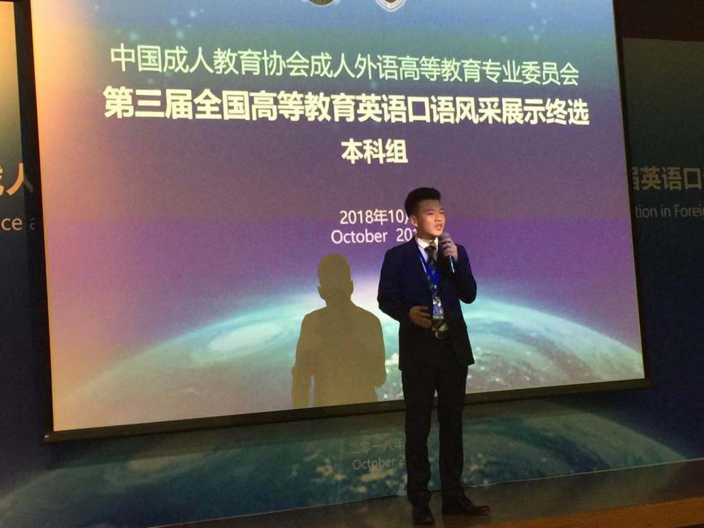 由中国成人教育协会成人外语高等教育专业委员会主办、北京外国语大学承办的第三届全国成人高等教育英语口语风采展示活动全国总决赛于2018年10月27日在北京举行。继续教育学院夏梓艺术和杨欣川同学代表四川外国语大学分别参加专科组和本科组决赛。经过激烈角逐,两位同学凭借突出表现,获得专科组金奖和本科组银奖,肖亚迪老师获“优秀指导教师”奖。全国19所高校派出选手参加了本届总决赛,我校综合成绩名列所有参赛大学前茅。