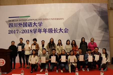 随后,由四川外国语大学年级长联席会成员华远波介绍联席会2017-2018学年度工作安排,同时也向与会2017级年级长发出诚挚的邀请。工作安排发言结束后,校学工部副部长、学生处副处长苏雪宣读了2016-2017学年优秀年级长表彰决定,与会辅导员为自己的年级长颁奖并合影。