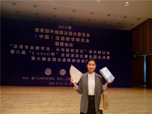 2015年12月12日,第八届“卡西欧杯”全国法语演讲比赛在厦门举行,我校法语系2013级黄依冰同学参加了比赛并成功获得全国三等奖。