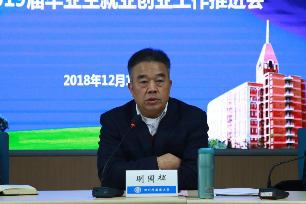 明国辉结合当前大学生就业形势作了讲话。他指出,毕业生就业情况历来是党和政府高度关注的热点问题。他强调,针对国内外宏观经济形势、智能化发展趋势以及就业市场局限等现实情况,我校急需进行就业工作改革。在严峻的就业形势下,学校高度重视就业工作,打破传统思维,积极开拓各种就业渠道;处于学生工作一线的辅导员们应顶住压力,实事求是,充分挖掘学生潜能,搭建就业创业平台。他指出,我校创新创业平台“起步晚,起点高”,同时希望各院系积极动员更多低年级学生参与“双创”,为学校培养更多“外语+技能”的复合型人才。