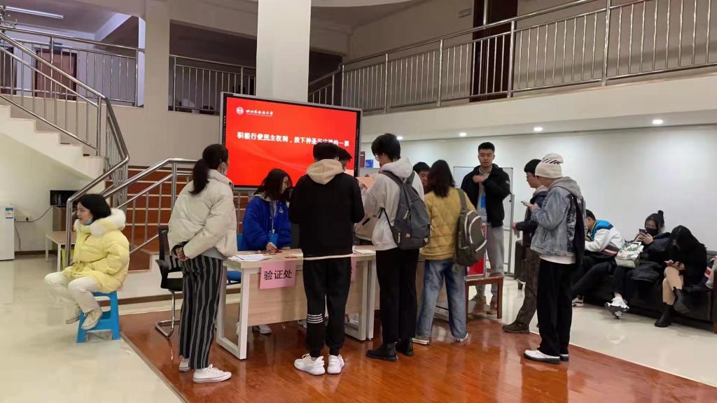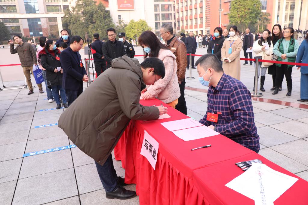 为确保选举顺利进行,我校在西区歌乐广场与立德楼A栋共设置25个投票站。上午9时,工作人员严格按照投票选举程序,宣读监票人与计票人名单,监票计票人现场检查票箱。选举在庄严的国歌声中正式拉开帷幕。全校各学院投票站(点)将五星红旗、红色条幅与投票箱摆在醒目位置,全校师生按照投票选举程序和疫情防控要求,佩戴好口罩,依次排队领取选票,以饱满的政治热情、认真的态度,依据选民证有序领取选票,按照选举说明认真填写选票,依次走到投票箱前,郑重投下手中庄严神圣的一票。校领导在相应选民小组以普通选民身份进行了投票。投票过程公开透明、庄严有序。