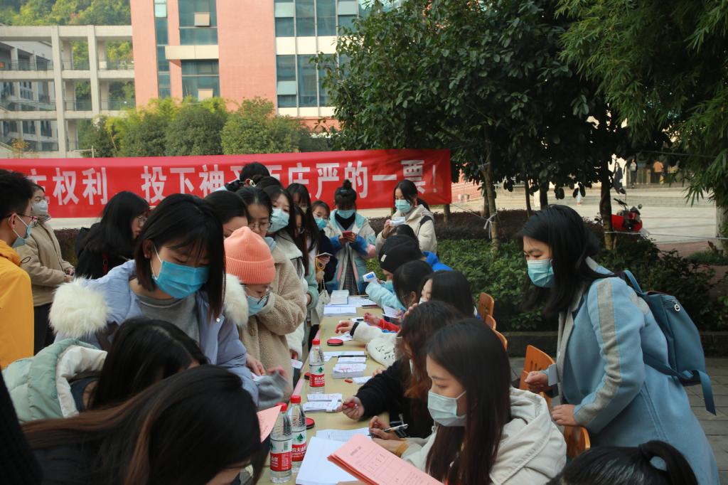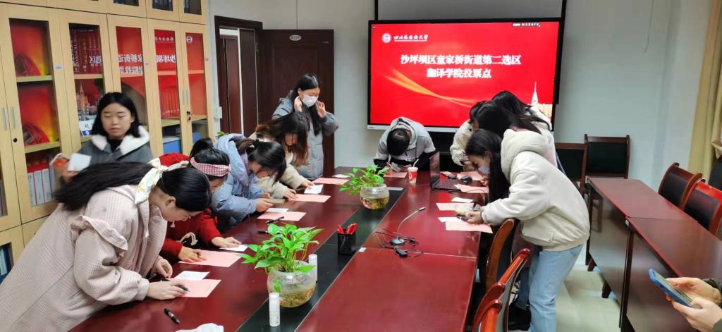 人大代表换届选举是人民政治生活中的一件大事。学校党委高度重视此次选举工作,成立了选举工作领导小组,严格依照《选举法》和沙坪坝区换届选举相关要求组织落实选举工作。今日,各投票站点工作人员严格遵守选举流程,做好选票的发放、回收、计票和封存。同时按照防疫防控要求,选区现场还配备洗手剂、消毒液等防疫物资,设置测温台和临时隔离场所。在各部门的精心组织和通力协作下,学校圆满完成了此次选举投票工作。
