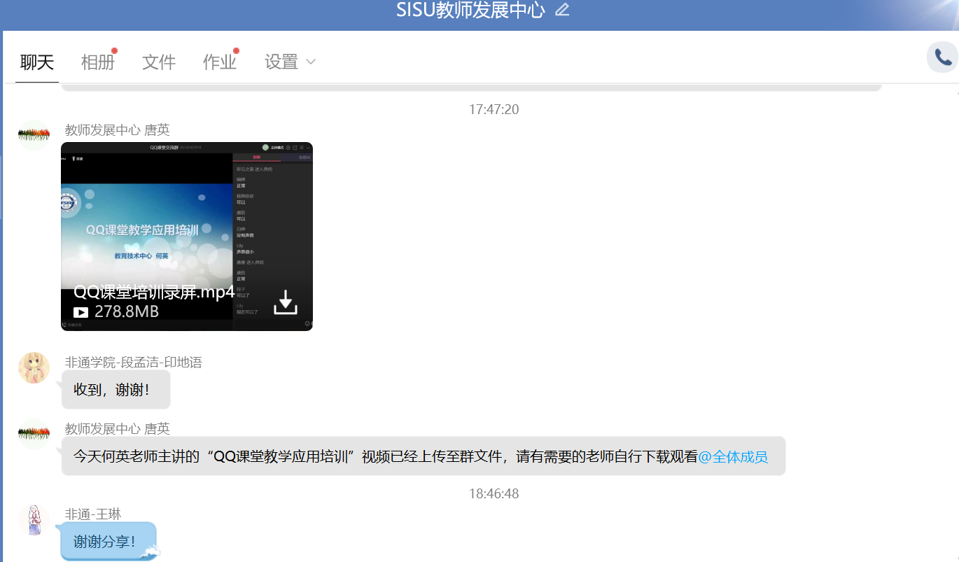 课后,中心将此次培训的录屏、同步在线教学课堂安装软件和操作指南在工作群中进行了分享。