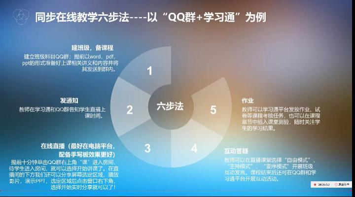 在线教学模式主要有师生同步在线的直播课和以视频资源为核心的自主学习课程,何老师介绍了同步在线教学六步法,并建议针对课程的不同类型,采用相适的教学形式。同时,就优秀教师变身超级主播,在软硬件配置方面给出了建议。