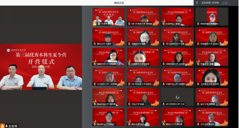 7月10日上午9时,夏令营开营仪式如期举行。学校副校长王仁强,研究生院院长赵永峰、副院长陈明志在研究生院主会场,各学院领导、全体营员和师生代表通过网络视频参加了开营仪式。
