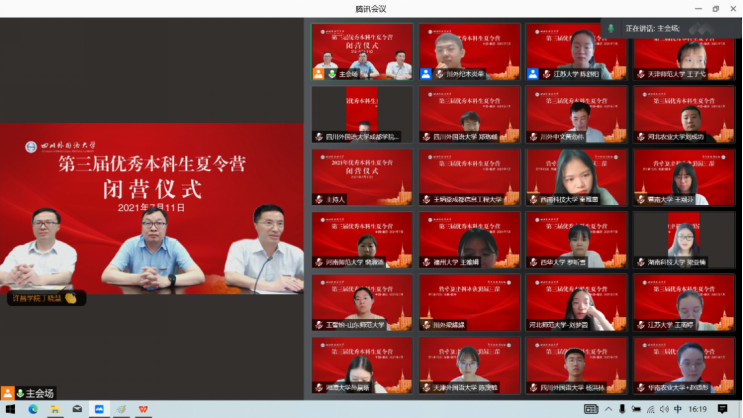 7月11日下午4时,夏令营圆满完成各项活动,举行闭营仪式。研究生院赵永峰院长、刘兴兵副院长、陈明志副院长在主会场参加闭幕仪式,同线上的各学院领导老师和全体营员再次共聚一堂。闭幕仪式上,营员代表纪木炎荣和陈舒阳先后分享了参加本届夏令营的收获和感悟。赵永峰院长还针对营员们在研究生备考中的疑惑进行了梳理和解答。