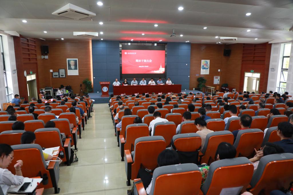 校长董洪川总结了上半年学校工作:全面从严治党取得新成效,立德树人根本任务落实有力,双一流建设取得实效,师资队伍建设取得进展,国际合作与交流取得新成果,新文科建设特色发展,校地合作持续推进,办学治校和治理能力不断优化,民生保障不断完善。董洪川分析了学校在办学资源、治理能力、巡视整改、学科专业建设方面仍存在的短板,并就干部治理能力的提升提出要求:既要向前看,吸取过往经验;又要向后看,关注发展趋势,预判风险。既要向上看,提升法规意识;又要向下看,研究解决实际问题。