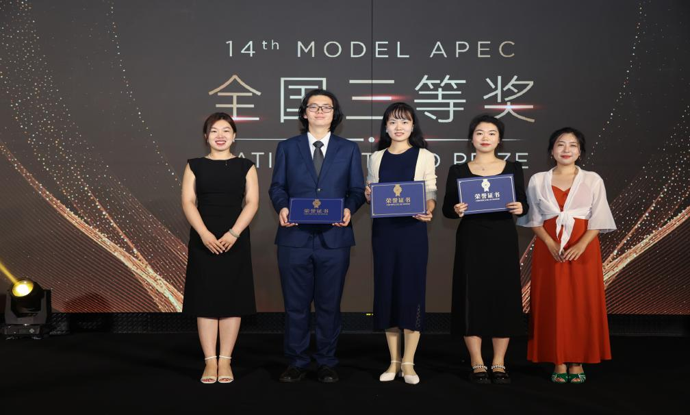 2023年8月25日至27日,第十四届亚太青年模拟APEC大会(14thModel APEC)全国总决赛在苏州举行,来自北京师范大学、外交学院、上海外国语大学、吉林大学等全国36所高校的55名选手入围全国总决赛。我校Model APEC协会选派的4名选手在总决赛中表现出色,其中来自英语学院的杨雪滢同学获全国三等奖,胡方婷同学获“最佳文案奖”,英语学院的雷清媛与国际关系学院的周淑华两位同学获全国百强荣誉,指导教师张国玺获全国大会优秀指导教师奖,国际关系学院2021级国际组织人才实验班施宇澄同学应邀担任大会副主席。我校同时获得大赛最佳组织奖,并被授予“国际化人才高校培养基地”。
