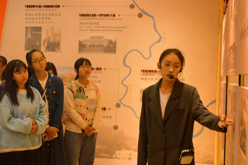 在讲解员的带领下,全体新生分批次井然有序地进入校史馆。通过追溯学校发展历程,深入了解校训校风、办学特色、人才培养、科学研究、校园文化、对外交流、党建与思政工作等各方面内容,全方位多角度地领略了我校的历史变迁与显著成就。从1950年中国人民解放军西南军政大学俄文训练团的创建,到西南俄文专科学校、四川外语学院以及“海纳百川,学贯中外”的四川外国语大学的建设发展。学校跨越了71年的办学历程,一张张承载历史的图片,一件件富有底蕴的实物,一行行含义隽永的文字,无一不使新生充分感受到建校71年来积淀的文化底蕴与取得的辉煌成就。