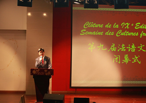 随后,法语系党总支书记杨少琳老师主持了本届法语文化周闭幕式。李克勇校长登台致辞,赞扬了此次法语文化周法语系师生的优秀表现,同时指出了一些不足,他提出“先把法语说正确,再把法语说漂亮”,鼓励同学们好好学习,将来为中法交流与合作做贡献。李克勇校长对法语系校友、崇新奖学金创立者赵崇新先生多年来对法语系的支持表示了由衷的感谢;同时还感谢了法语系前系主任、法语文化周的创办者之一尹丽老师多年来为法语系的付出,并赠与其自己和团队翻译的《中华文化概览》。