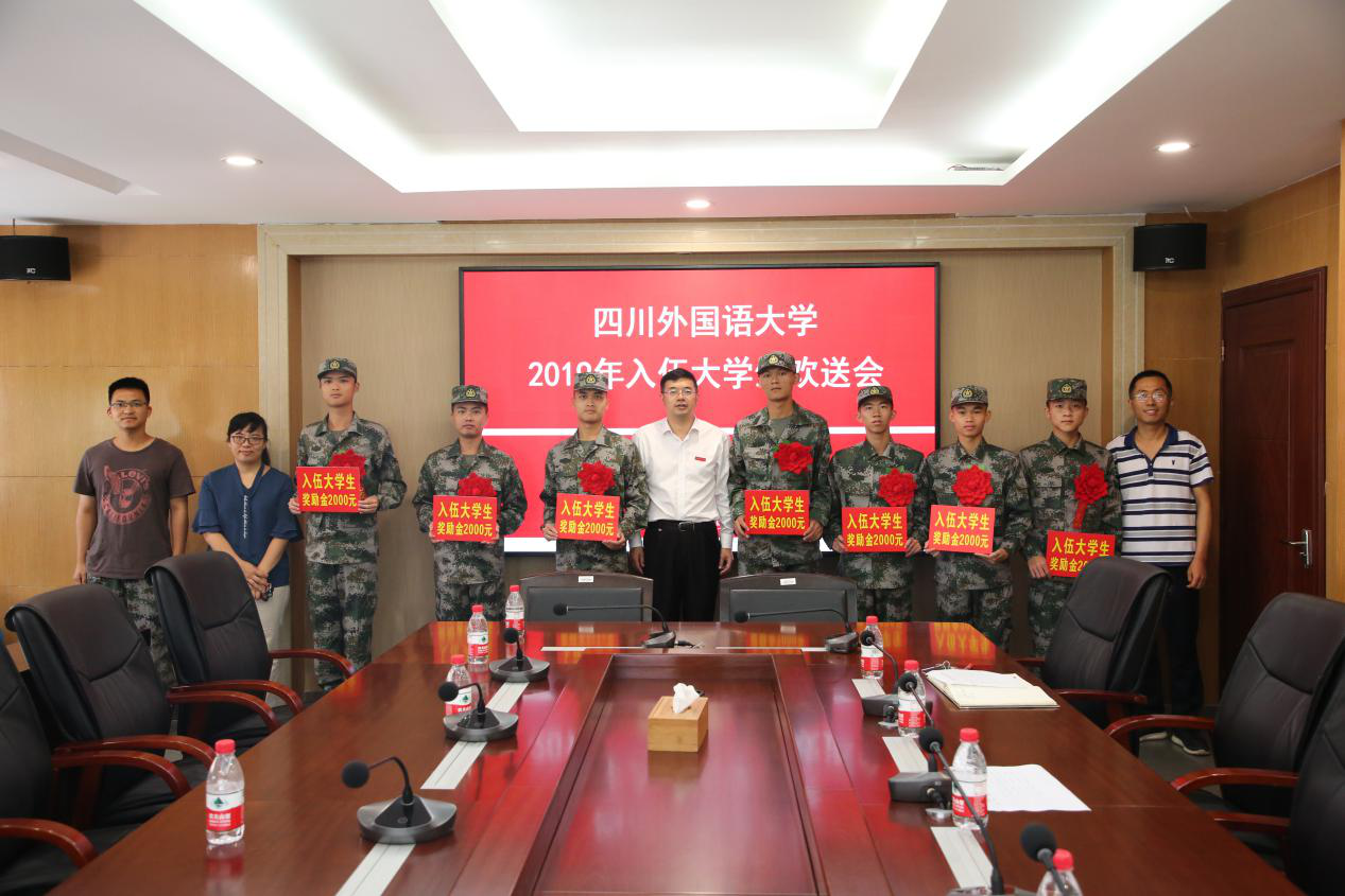 2019年9月16日上午10点,四川外国语大学2019年应征入伍大学生欢送会在行政楼A301会议室顺利举行,学校党委书记邹渝出席,学生工作部部长吴维均、副部长何敏参加。