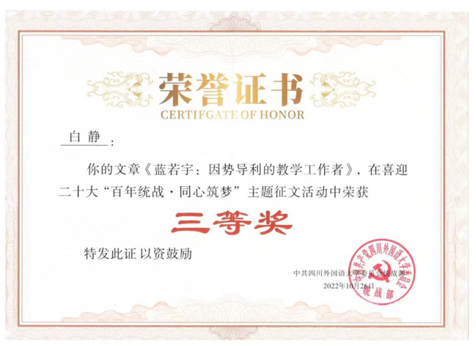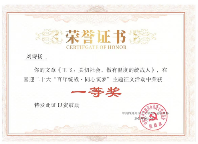 由学校党委统战部主办的喜迎二十大“百年统战 · 同心筑梦”主题征文日前结束。征文评出22篇获奖作品,新闻传播学院6篇作品获奖,其中,2020级本科生、《川外新传》首席记者刘诗扬获一等奖 ,另有5名同学分别获得二等奖和三等奖。