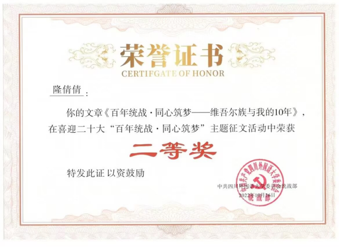 隆倩倩:《百年统战·同心筑梦——维吾尔族与我的10年》,2022级研究生。