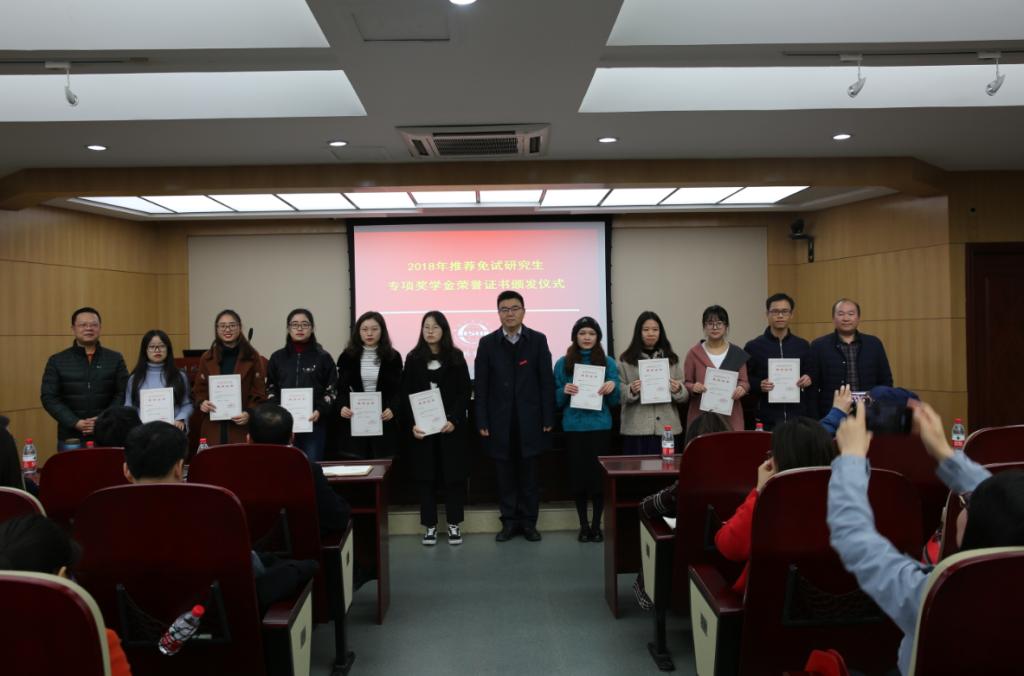 2018年12月3日下午,学校为首批获得本年度“推免研究生专项奖学金”的2018级研究生举行了颁奖仪式。副校长董洪川、研究生院院长王仁强、党委研究生工作部部长淡修安为张蓝月等17名2018级推免研究生颁发了荣誉证书。各研究生培养单位负责人、职能部门负责人及研究生学生代表参加了颁奖仪式。