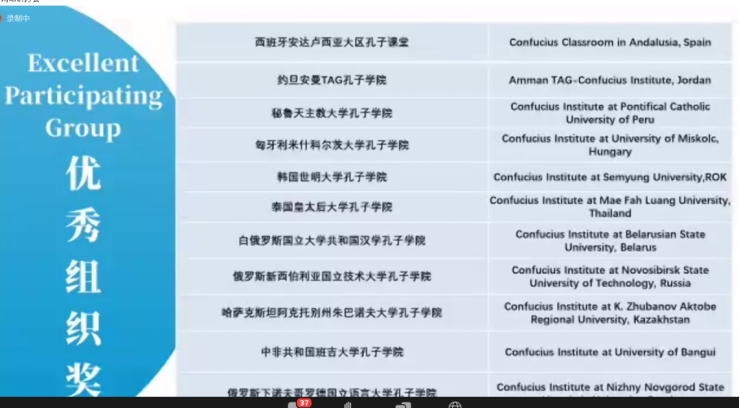 2021年11月26日,“最·孔院”短视频征集活动颁奖典礼暨“孔院达人”称号授予仪式面向全球在线上举办。现场揭晓了万众期待的百部入围作品的获奖名单,颁发了优秀组织奖、最具人气奖、“孔院达人”荣誉称号等各类奖项的荣誉证书。