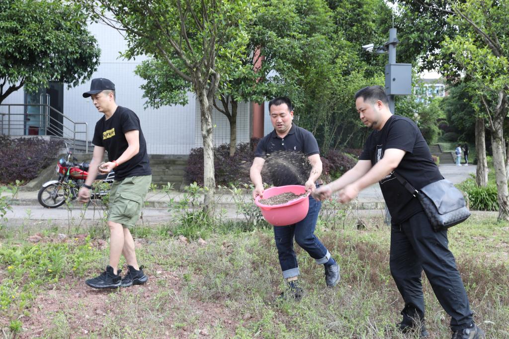 活动开始后,王仁强带领全体党员一起播撒景观花籽并均匀浇水。结合当前时令和校园绿化的特点,后勤基建管理处和龙湖物业为此次活动精心准备了格桑花种。在初夏炙热的阳光下,党员同志们几人一组,齐心协力、配合默契,活动现场热火朝天,忙碌有序。经过近1个小时的紧张劳动,大家共播撒景观花籽、底肥100余公斤。