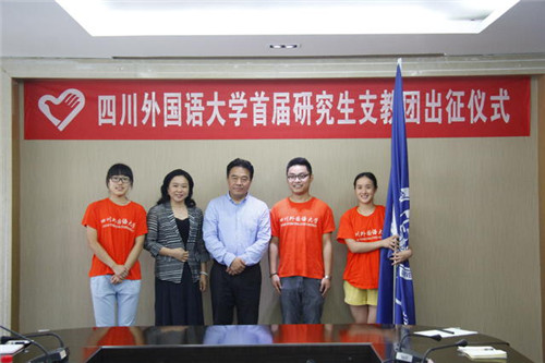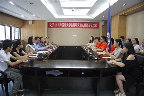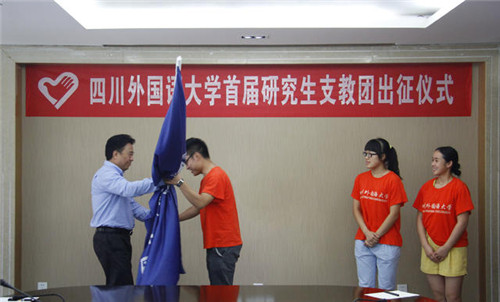 7月9日上午,四川外国语大学首届研究生支教团出征仪式在行政楼a301举行。校党委书记明国辉、副校长郑白玲出席了出征仪式。我校首届研究生支教团成员以及第二届研究生支教团预备训练营成员参加了出征仪式,仪式由校团委书记丁欢主持。