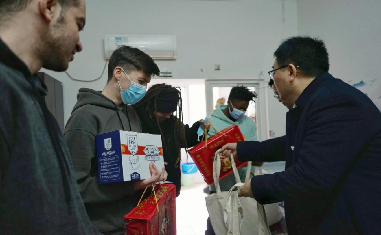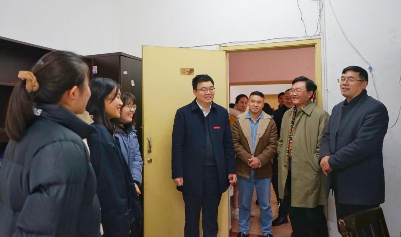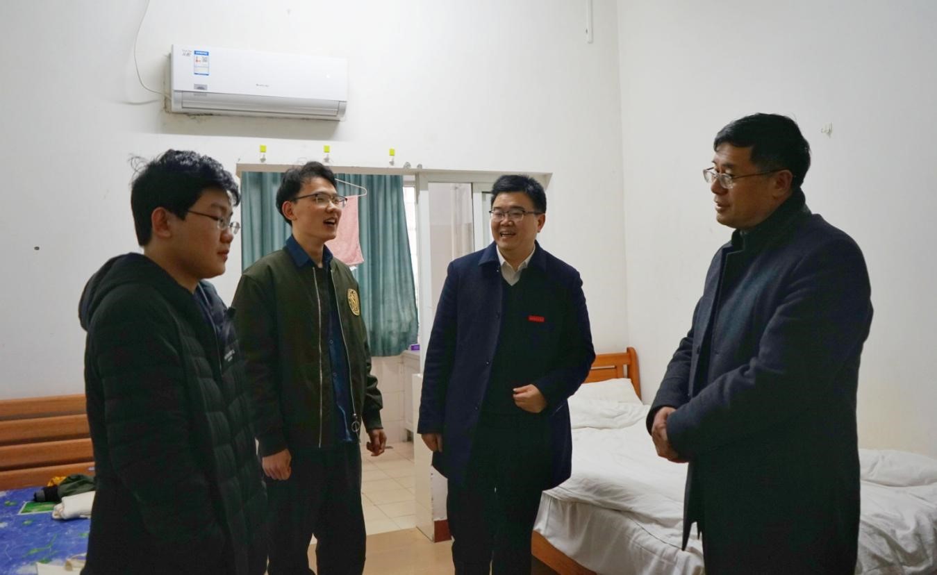 校领导一行来到留校学生集中住宿点兰苑8舍,详细了解了学生假期的学习、住宿、用餐等生活情况。走进寝室,与留校学生代表进行了亲切交流,听取同学们的留校情况,代表学校向同学们送上节日的祝福和慰问品。