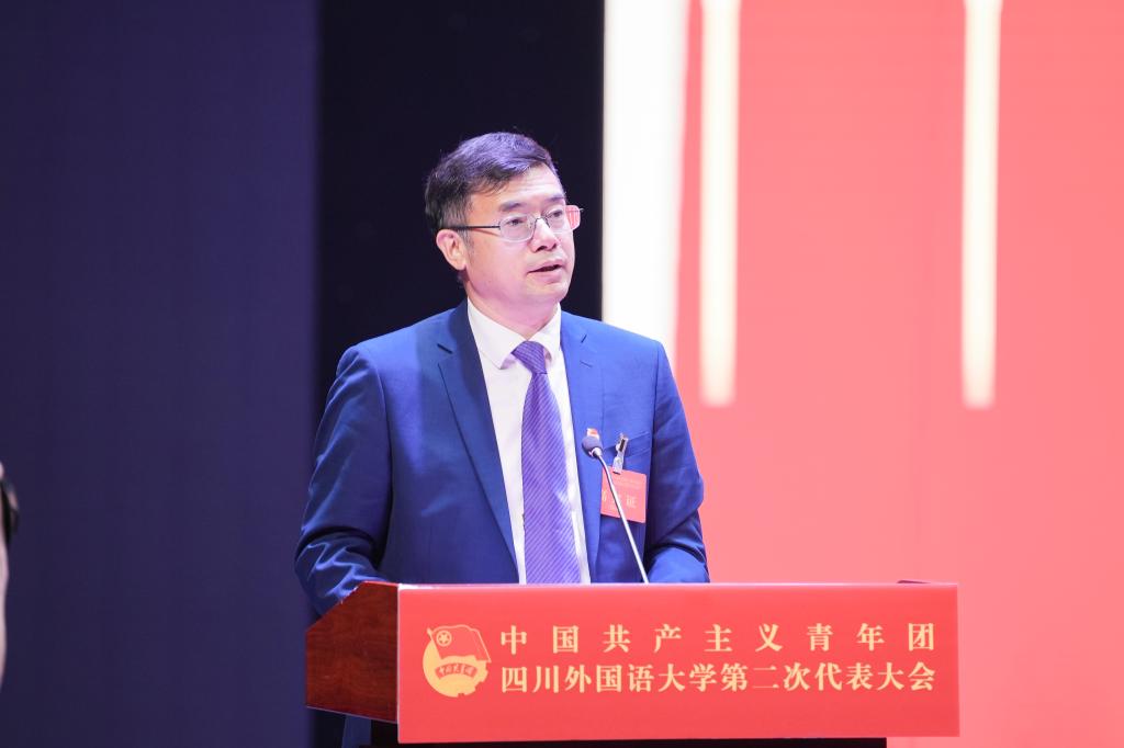 校党委书记邹渝在大会上向全体团学干部、共青团员、青年大学生致以问候,并发表讲话。他指出,共青团四川外国语大学第一届委员会立足共青团“三个根本性”问题,从严治团,在组织动员青年、教育引导青年、服务联系青年、维护青年合法权益等方面发挥了桥梁和纽带作用,为学校争取青年人心、汇聚青年力量、完成中心工作等方面作出了应有的贡献。邹渝向川外青年提出三点希望。一是川外青年要准确识变,胸怀“两个大局”,做追梦路上的开拓者。要提升国际视野,准确认识到“船到中流浪更急、人到半山路更陡”;要准确认识到中华民族伟大复兴绝不是轻轻松松、敲锣打鼓就能实现的,必须进行具有许多新的历史特点的伟大斗争;要准确认识到肩负的重大历史使命和时代责任。在面对前进道路上的荆棘坎坷,要迎难而上,要有越是艰险越向前的信念,做一个有狼性血性、敢闯会创的新时代川外人。二是川外青年要积极应变,心怀“忧患意识”,做追梦路上的奋进者。要树立忧患意识、危机意识,不断增强知识更新的紧迫感,如饥似渴学习,既扎实打牢基础知识又及时更新知识,既刻苦钻研理论又积极掌握技能,努力成为“一精多会”“一专多能”的复合型国际化人才。要坚持学以致用,深入社会、深入基层,在社会的大学校掌握真才实学,锻造本领能力,努力成长为可堪大用、能担重任的栋梁之材。三是主动求变,培养“担当精神”,做追梦路上的奉献者。要站在新时代高度,把准时代的脉搏,主动求变,突破从自身角度、从理想状态认识和理解世界的局限,担当时代责任和使命、在奋斗中练就过硬本领、在实践中不断锤炼品德修为,不负时代所托。
