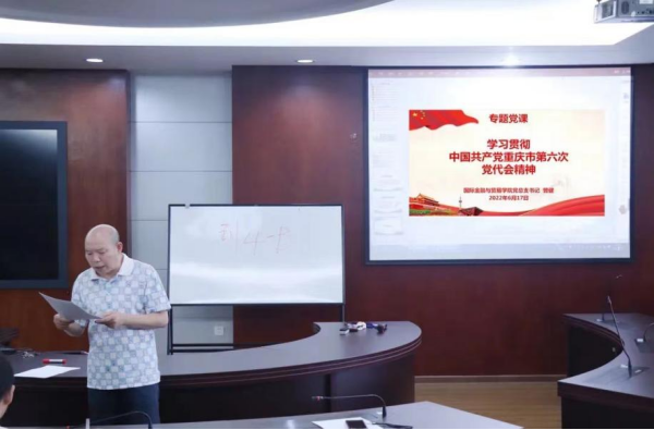 为深入学习贯彻习近平新时代中国特色社会主义思想,传达学习中国共产党重庆第六次代表大会精神,坚定拥护“两个确立”、坚决做到“两个维护”的鲜明态度,6月17日,国际金融与贸易学院党总支书记曾健主讲了题为《蓝图催人奋进征程勇毅笃行》的专题党课,全体教职工参加党课学习。
