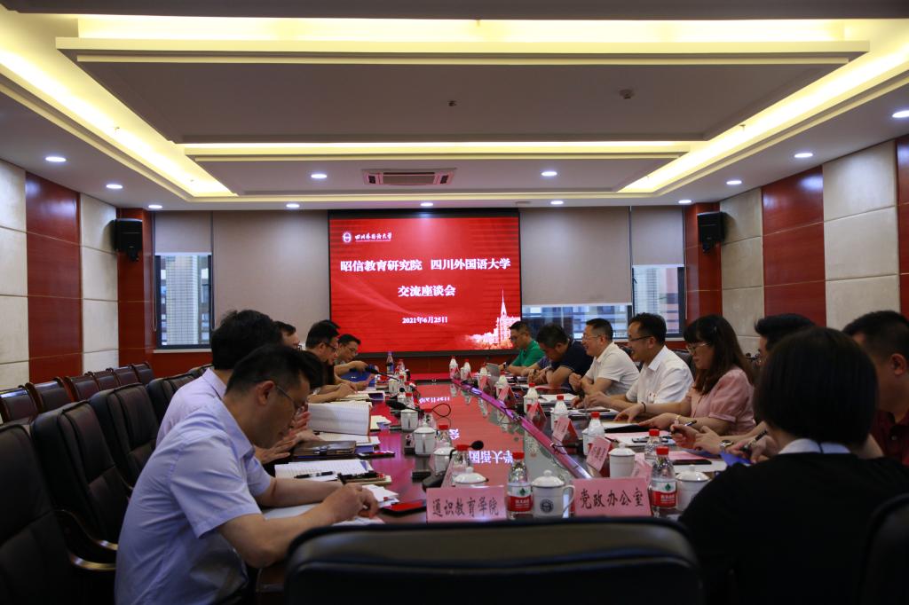 6月25日下午,重庆昭信教育研究院赴四川外国语大学交流座谈会在我校图书馆505会议室顺利举行。昭信教育研究院执行院长吴睫、副院长刘显忠、昭信教育科技集团数字化教学服务中心主任、高教社重庆教学服务中心副主任熊英、我校党委书记邹渝、副校长祝朝伟、教务处、招就处、网络信息中心等相关部门负责人出席座谈会。会议由我校教务处处长刘玉梅主持。