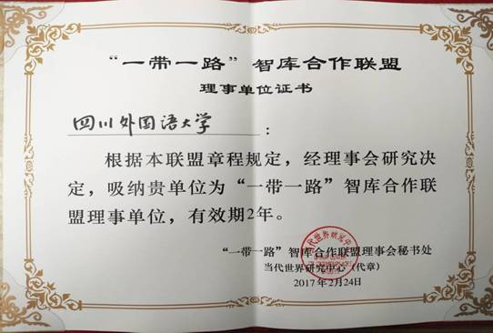 我校被增补为“一带一路”智库合作联盟理事单位证书