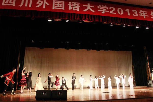 5月29日晚,由校教务处和校团委主办、国际关系学院承办的四川外国语大学2013年外语晚会在东区大礼堂拉开帷幕。四川外国语大学王鲁男副校长、校教务处廖峻副处长、校团委丁欢书记、校团委陈派副书记和各院系师生一同观看了晚会。在历时两天的活动中,由各二级学院、系、部及附属中学等单位选送的共12个语种、21个外语短剧纷纷登台,为川外师生带来了一场多语种、高水平的戏剧视听饕餮盛宴。