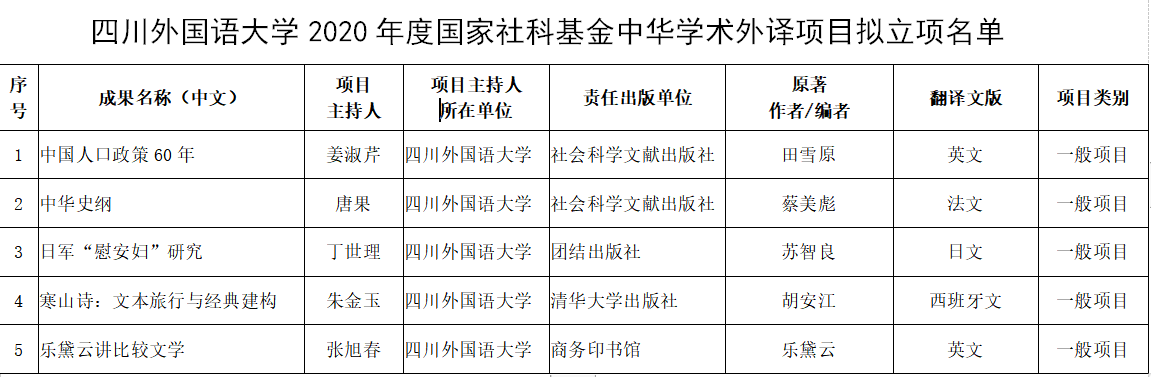 近日,全国哲学社会科学工作办公室公布了2020年度国家社科基金中华学术外译项目拟立项名单,本年度拟资助立项196项,其中我校共5项获立项,涵盖4个语种,立项数实现新突破,标志着我校双一流建设与科研工作取得新成效。