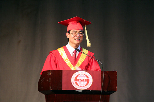 研究生指导教师代表周文德教授发言。他告诫同学们,社会不同于学校,大家需要用一辈子去学习和琢磨。一句“社会的路比川外的观云梯还要陡峭,绝不会像夺命坡和彩云梯那样轻松”,令在场观众笑声连连,掌声不断。他希望同学们勤动脑,多思考,不骄傲,不自卑,勇于面对生活。无论在什么样的岗位,都不要放弃曾经拥有的梦想。